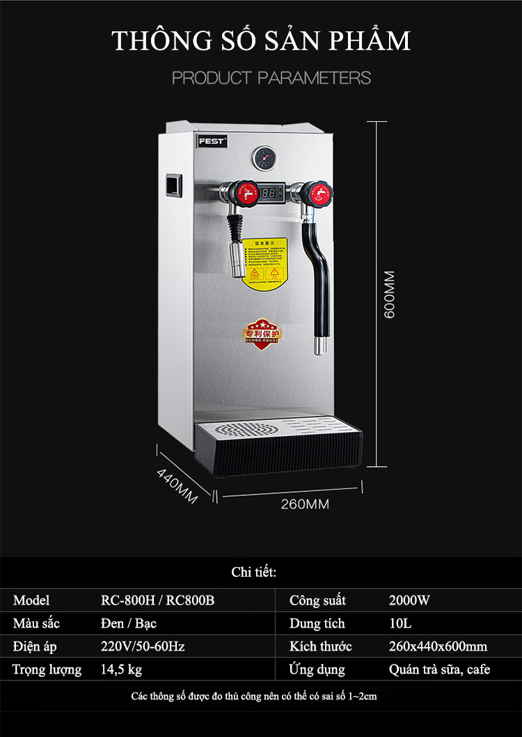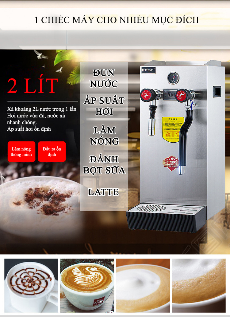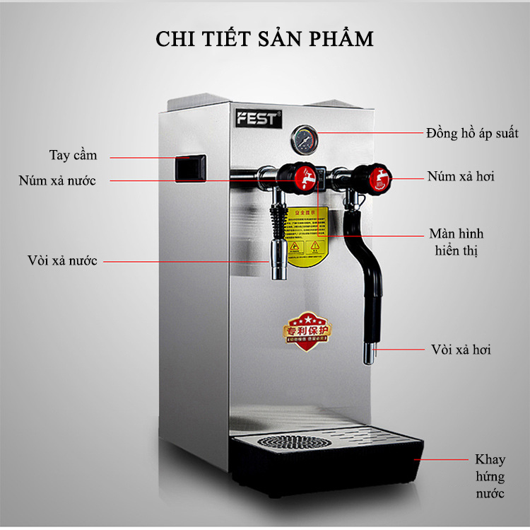Máy đun nước áp suất cao Fest có thiết kế nhỏ nhắn nhưng công suất mạnh mẽ. Hai chức năng chính của máy là đun nước nóng và tạo bọt sữa; đều sở hữu hiệu suất mạnh mẽ với cả hai chức năng này. Thiết bị được ứng dụng cho rất nhiều mô hình kinh doanh đồ uống như quán cà phê; quán trà sữa, quầy bar, nhà hàng, khách sạn…
