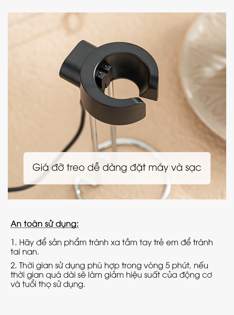 Giá đỡ máy kiêm bộ sạc nhanh, khi cần sạc pin bạn chỉ cần đặt máy vào giá đỡ, máy sẽ được sạc lại đầy pin trong vòng 2,5 giờ. Khi sạc đầy có thể dùng cho hơn 30 ly sữa