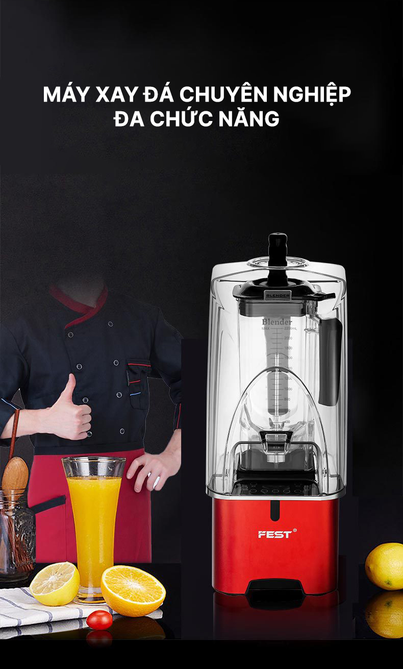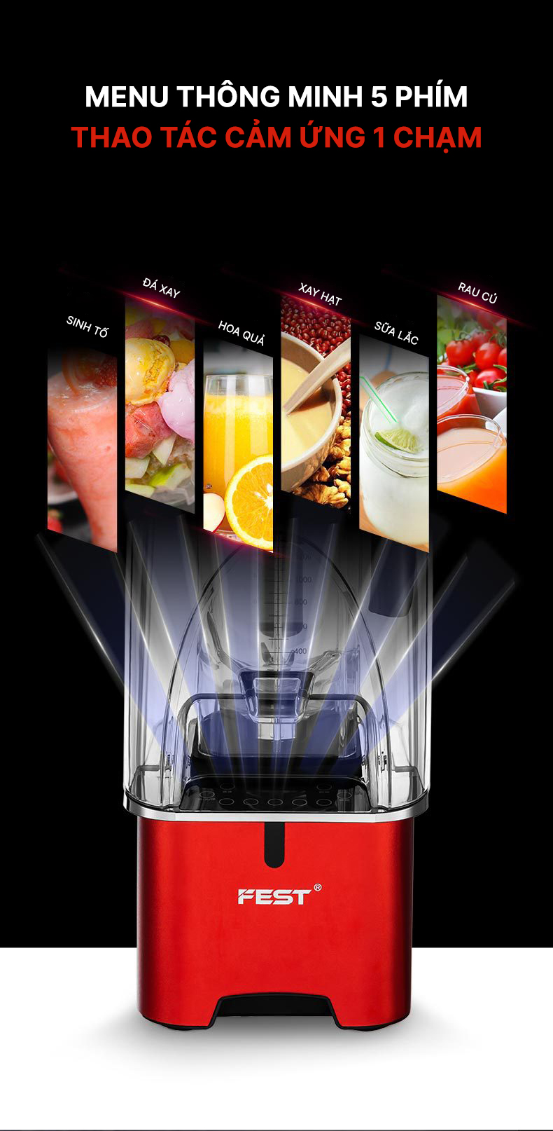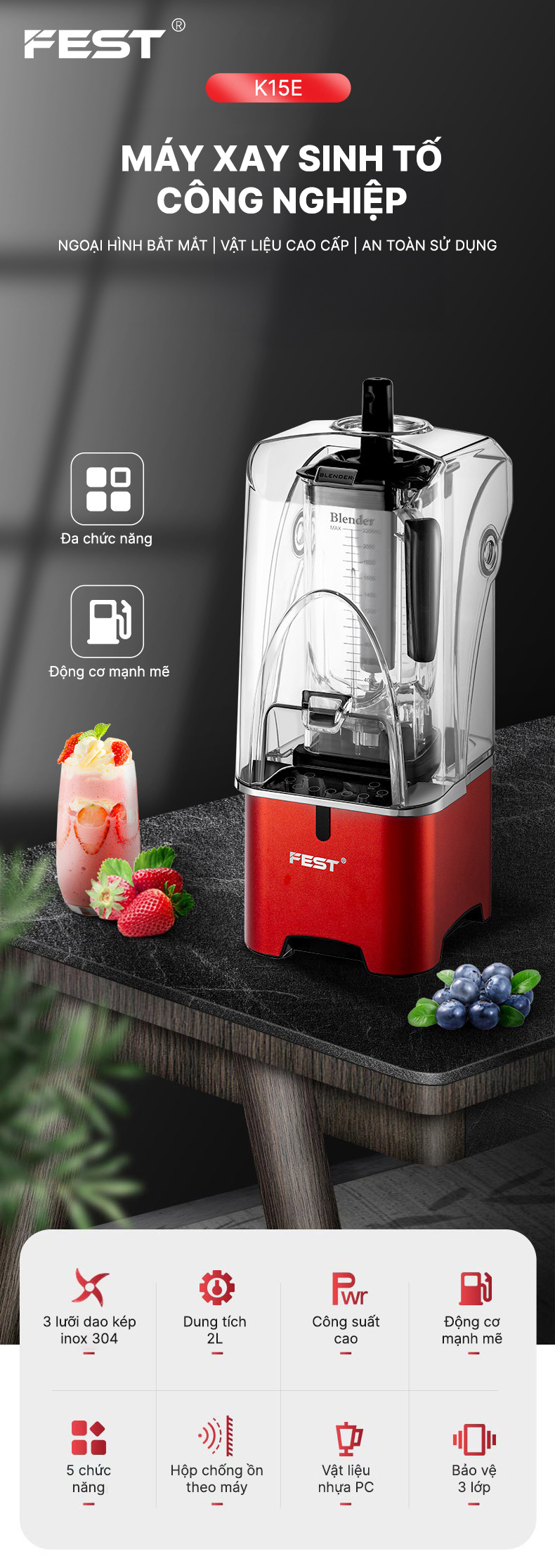 Máy xay sinh tố FEST K15E 2200W màu đỏ tinh tế, thiết kế sang trọng, phù hợp với không gian căn bếp hiện đại. Máy được làm từ những chất liệu an toàn, không gây hại (inox cao cấp, nhựa siêu bền, thủy tinh trong suốt), giúp bạn hoàn toàn yên tâm khi sử dụng. Kết cấu 2 lớp bảo vệ giúp giảm tiếng ồn cũng như an toàn cực cao cho người sử dụng.