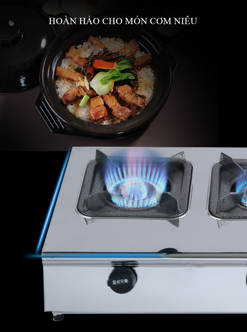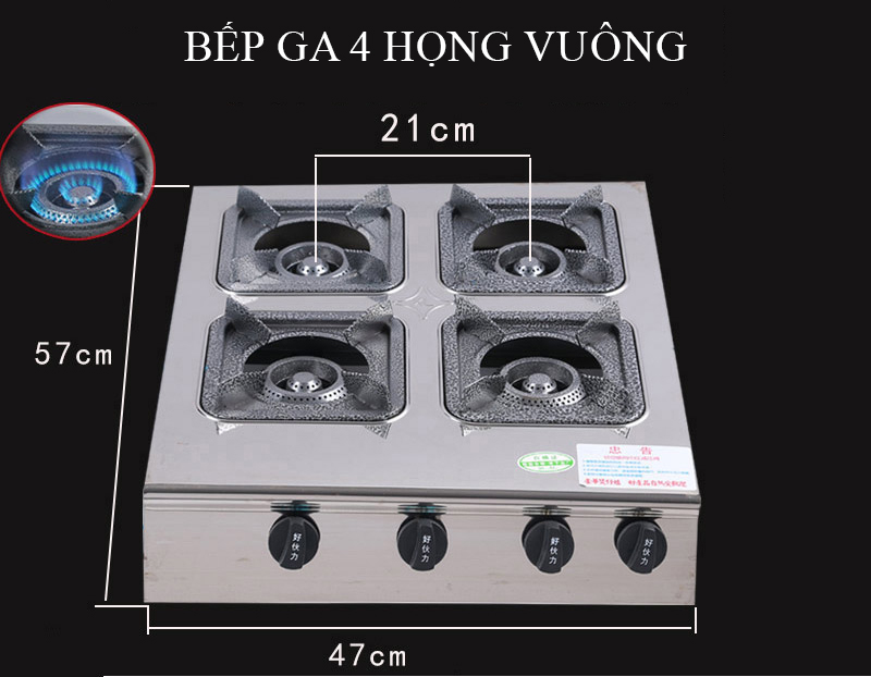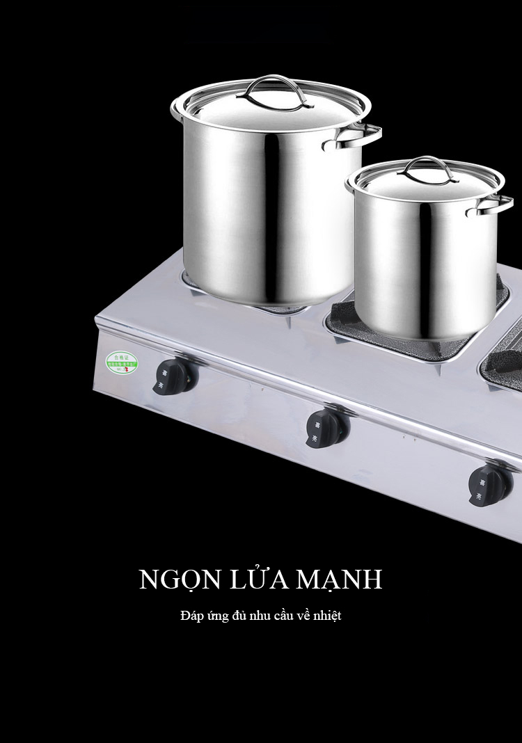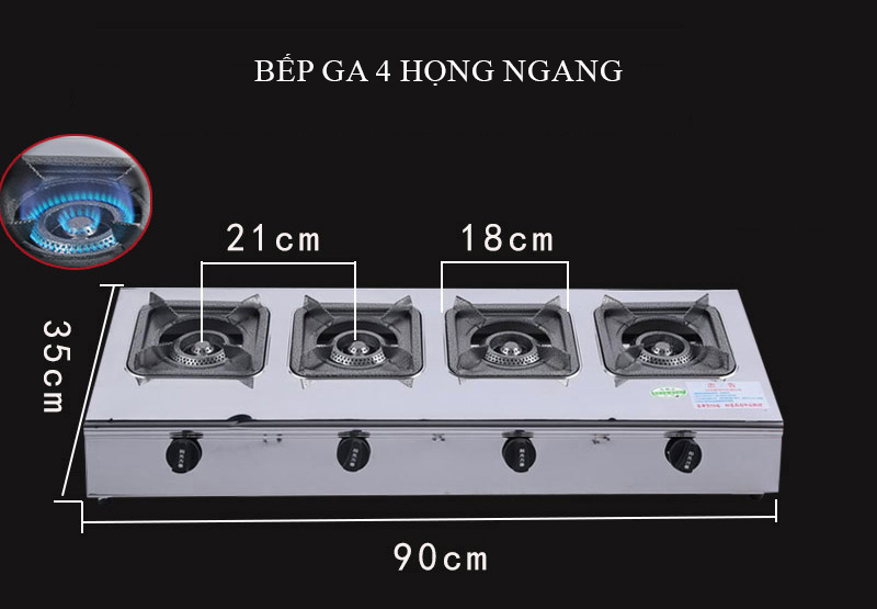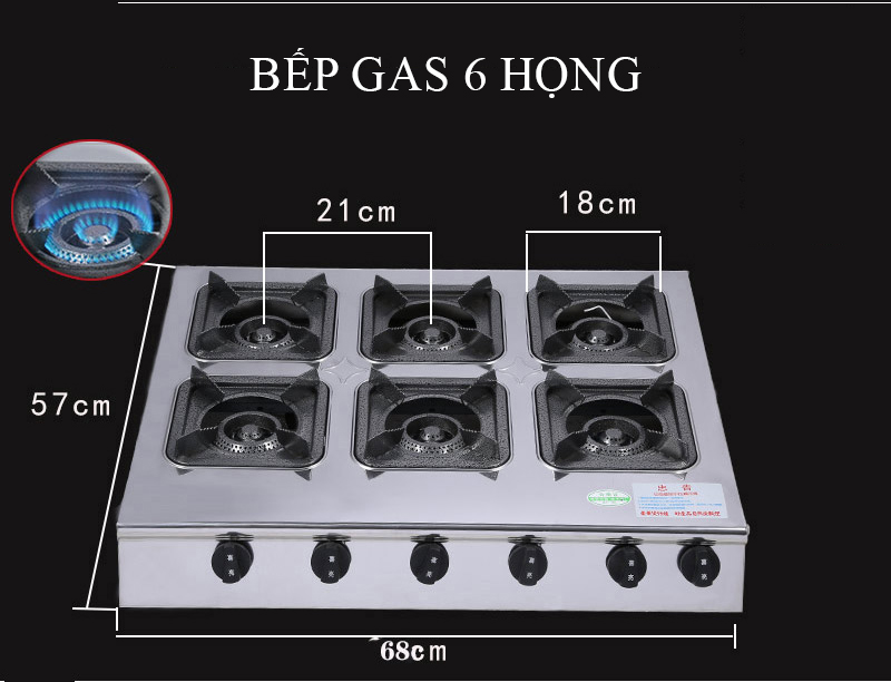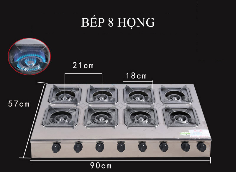 Thiết kế bếp đơn giản gồm 1 ống dẫn gas, 4-6-8 đầu đốt, mỗi đầu đốt được trang bị bộ đánh lửa riêng biệt, có thể nấu nhiều món ăn cùng lúc mà không mất nhiều thời gian chờ đợi