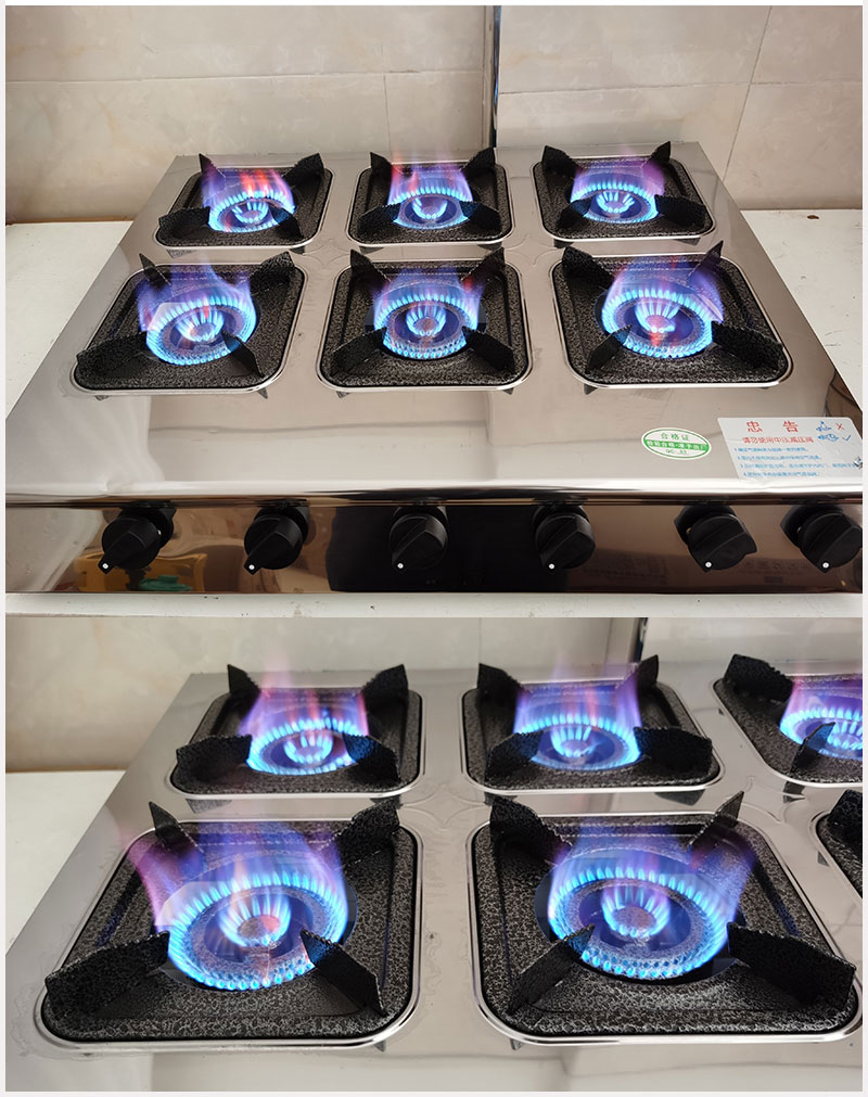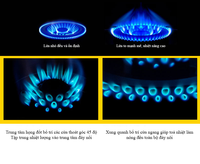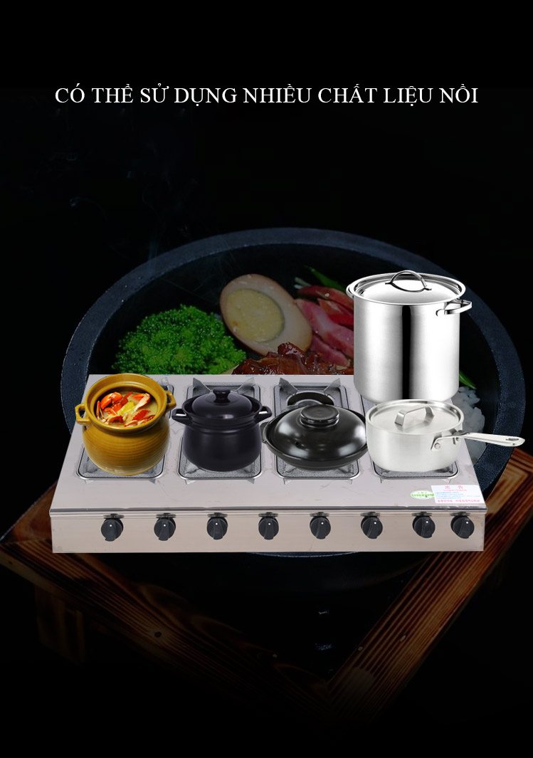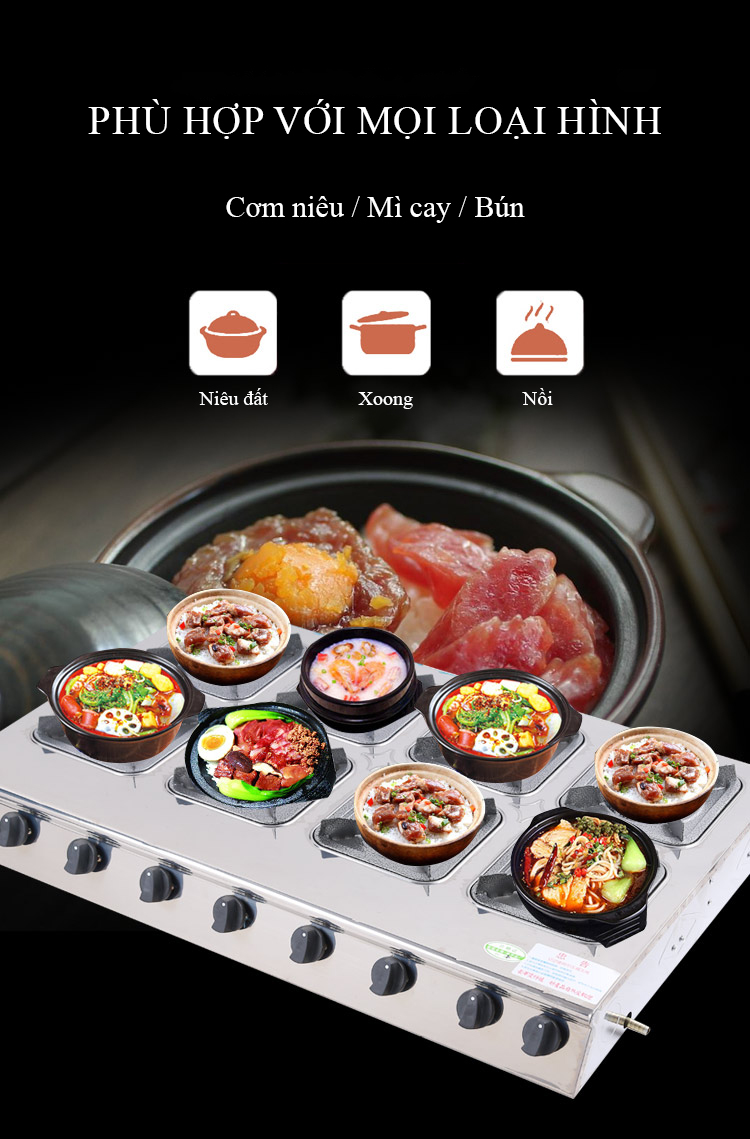 Thiết kế bếp đơn giản gồm 1 ống dẫn gas, 4-6-8 đầu đốt, mỗi đầu đốt được trang bị bộ đánh lửa riêng biệt, có thể nấu nhiều món ăn cùng lúc mà không mất nhiều thời gian chờ đợi